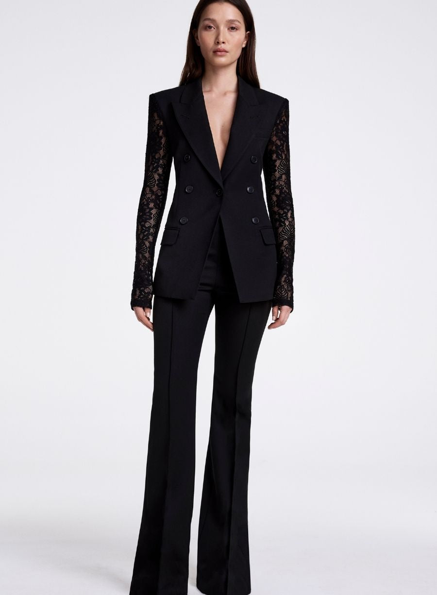Closely tailored and a best seller, this stretch peaked lapel longline silhouette has double breasted button placements but is actually a single-breasted blazer in disguise. Stretch lace sleeves make this perfect for holiday celebrations.