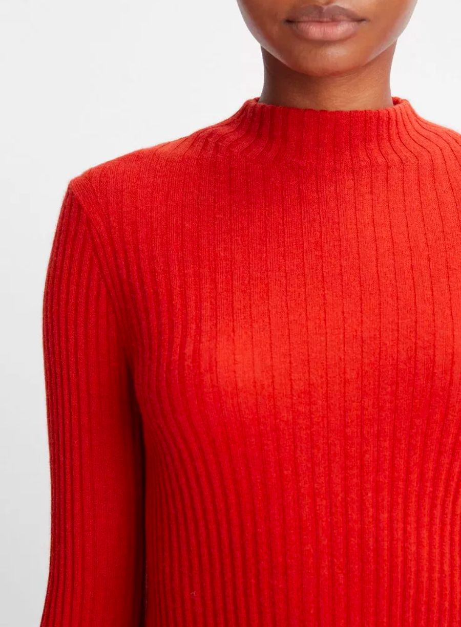 Ribbed Cashmere-Silk Mock Neck Sweater - Vermillion